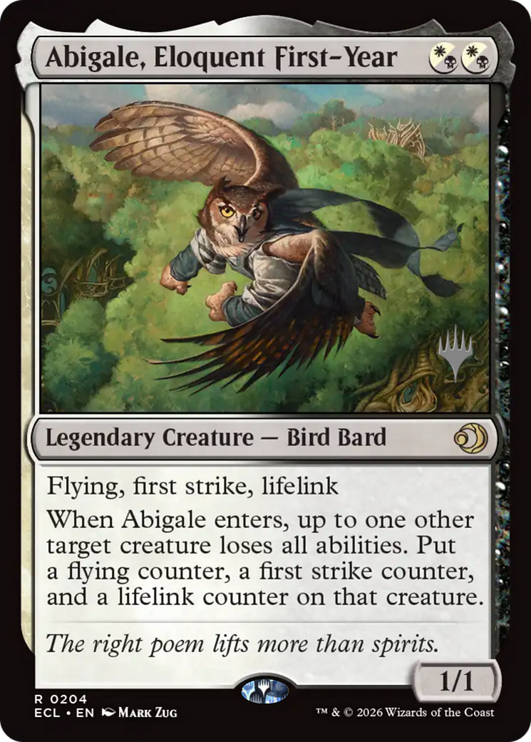When Abigale enters, up to one other target creature loses all abilities. Put a flying counter, a first strike counter, and a lifelink counter on that creature.
