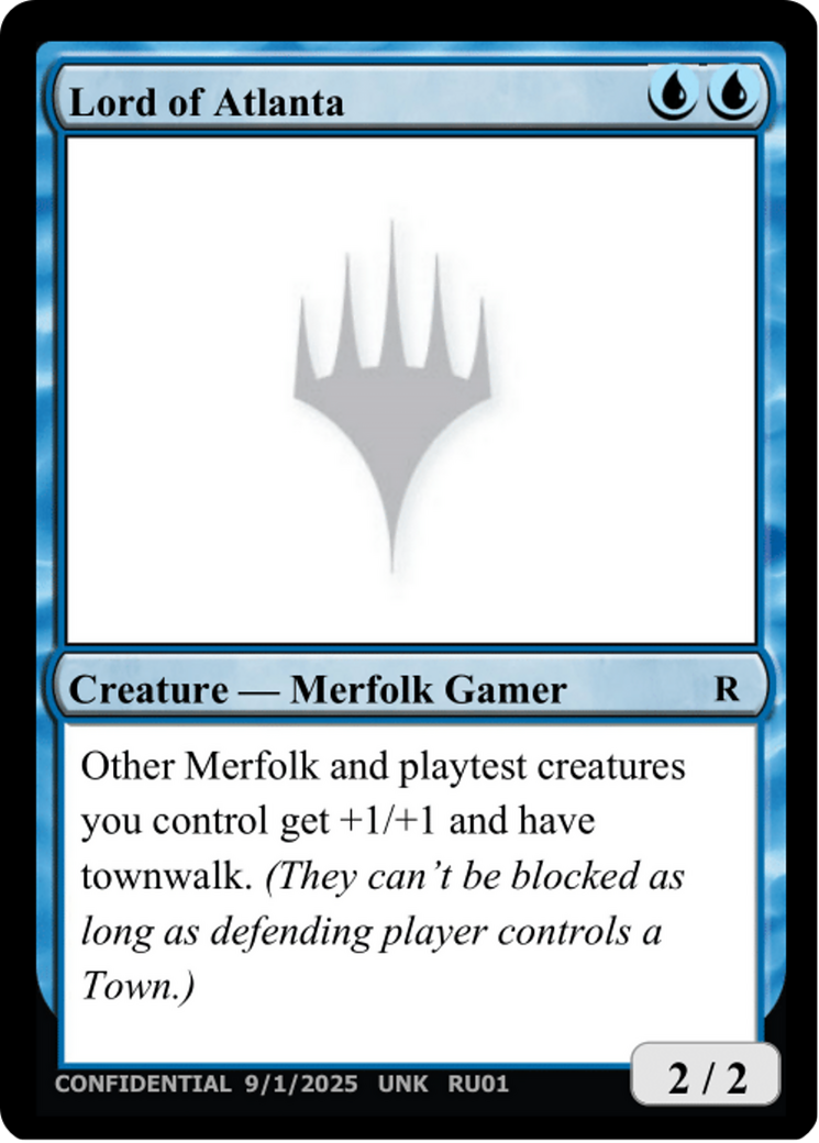 Other Merfolk and playtest creatures you control get +1/+1 and have townwalk. (They can't be blocked as long as defending player controls a Town.)
