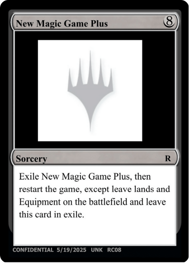 Exile New Magic Game Plus, then restart the game, except leave lands and Equipment on the battlefield and leave this card in exile.
