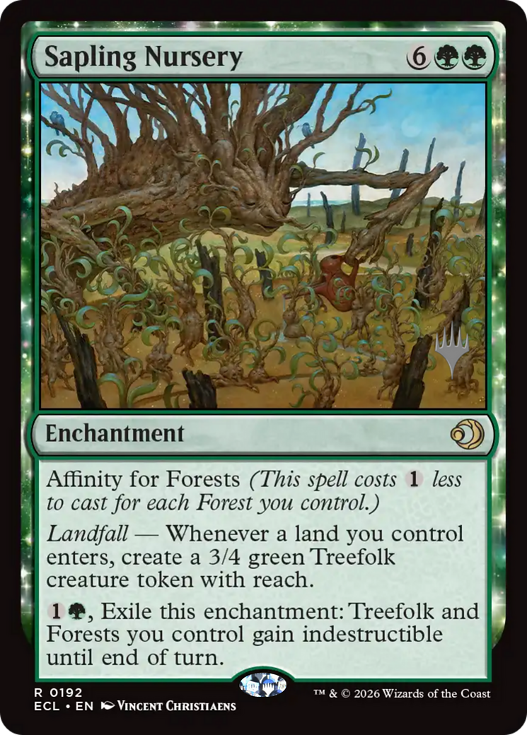 Landfall — Whenever a land you control enters, create a 3/4 green Treefolk creature token with reach.