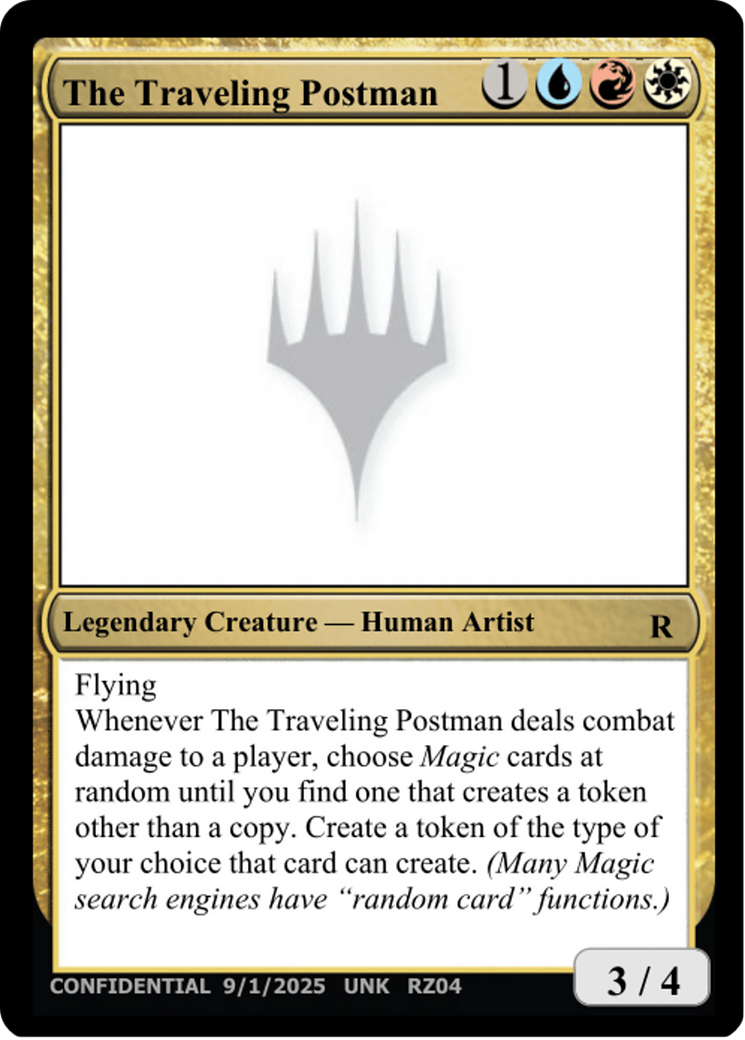Whenever The Traveling Postman deals combat damage to a player, choose Magic cards at random until you find one that creates a token other than a copy. Create a token of the type of your choice that card can create. (Many Magic search engines have "random card" functions.)