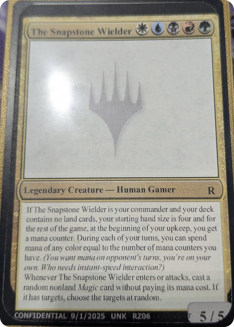 If The Snapstone Wielder is your commander and your deck contains no land cards, your starting hand size is four and for the rest of the game, at the beginning of your upkeep, you get a mana counter. During each of your turns, you can spend mana of any color equal to the number of mana counters you have. (You want mana on opponent's turns, you're on your own. Who needs instant-speed interaction?)