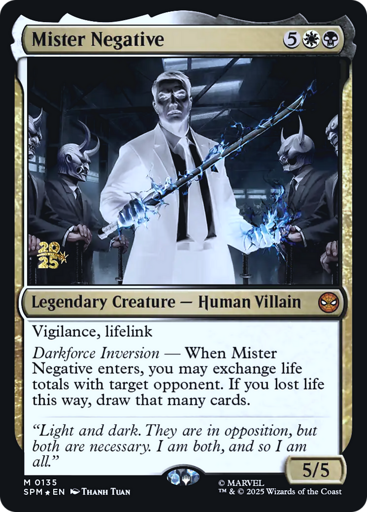 Darkforce Inversion — When Mister Negative enters, you may exchange life totals with target opponent. If you lose life this way, draw that many cards.