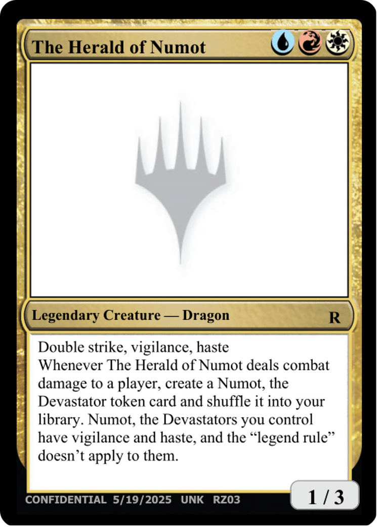 Whenever The Herald of Numot deals combat damage to a player, create a Numot, the Devastator token card and shuffle it into your library.