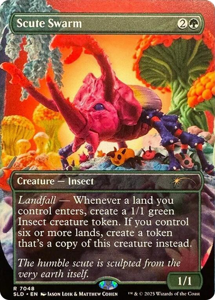 Landfall — Whenever a land you control enters, create a 1/1 green Insect creature token. If you control six or more lands, create a token that's a copy of this creature instead.