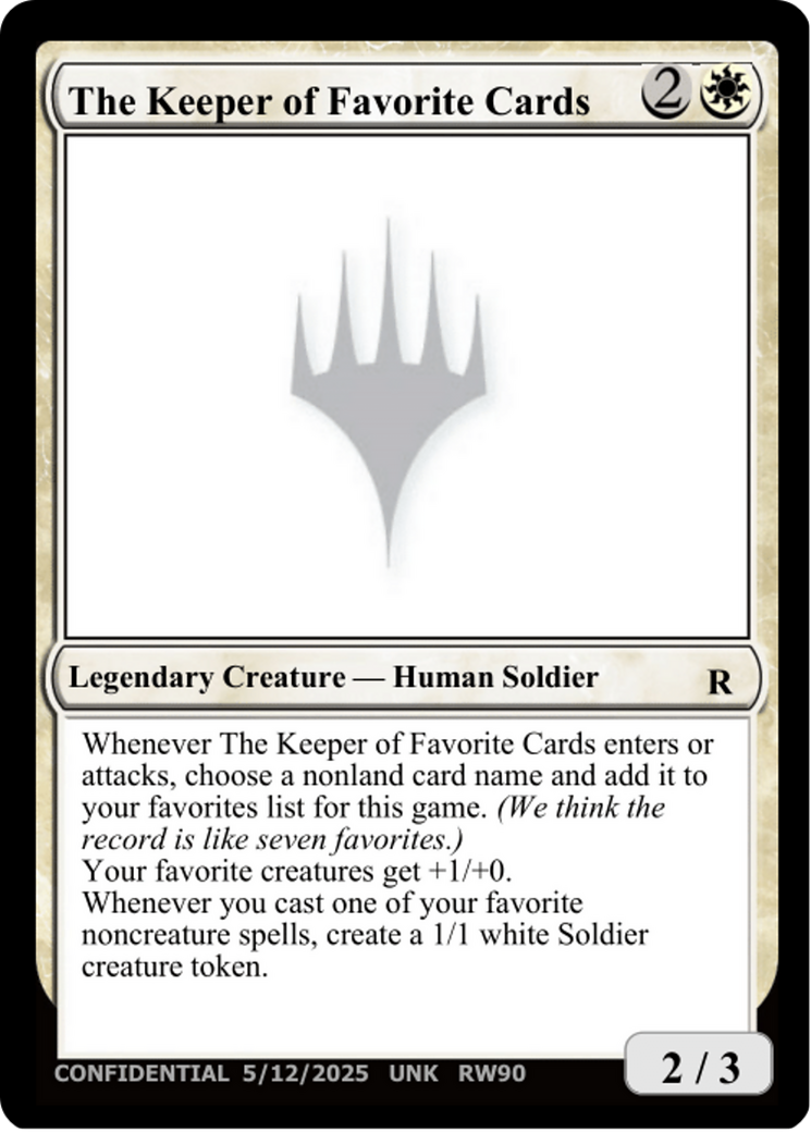 When The Keeper of Favorite Cards enters the battlefield or attacks, name a nonland card and write it on your favorites list for this game. (You can have limitless favorites.)