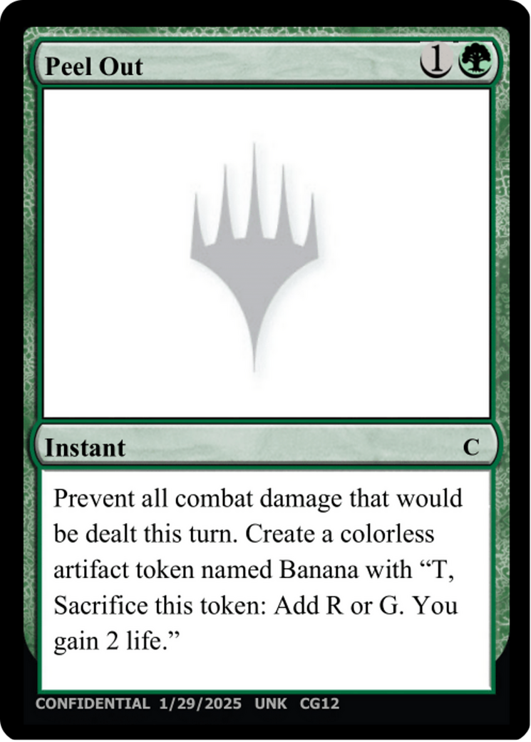 Prevent all combat damage that would be dealt this turn. Create a colorless artifact token named Banana with ", Sacrifice this token: Add