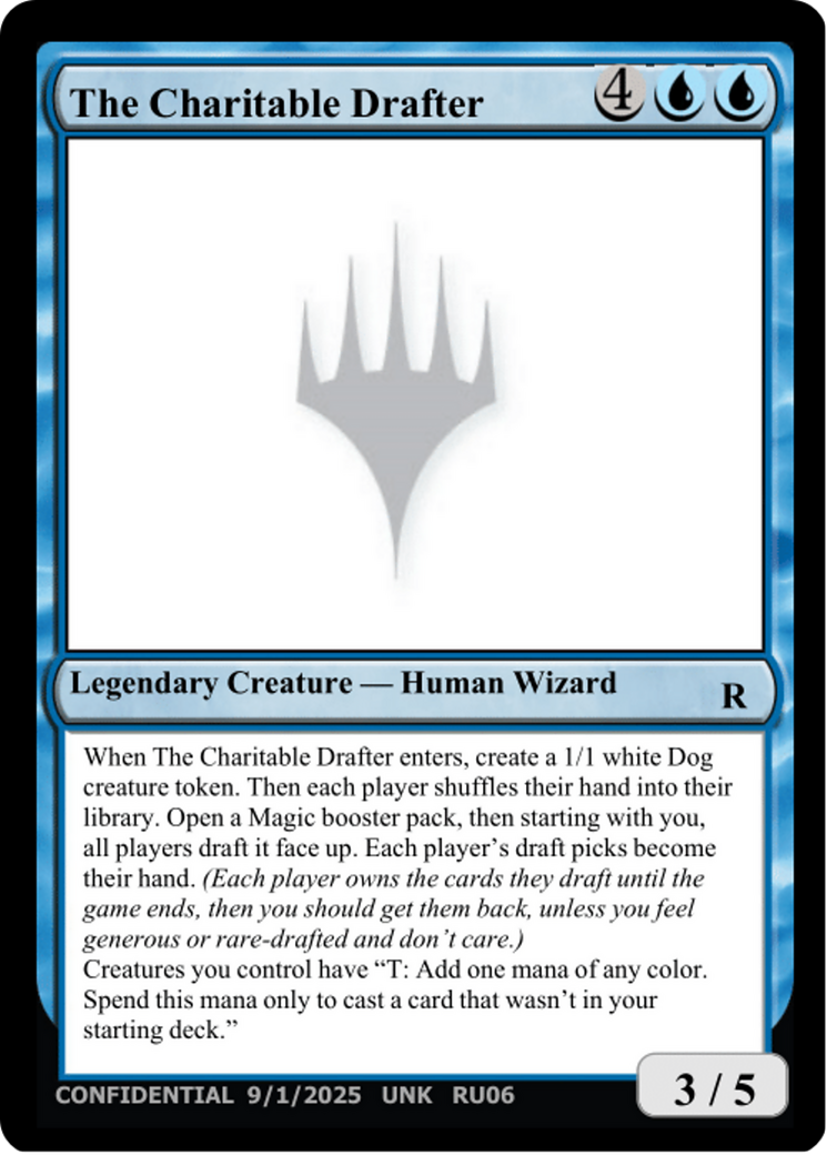 When The Charitable Drafter enters, create a 1/1 white Dog creature token. Then each players shuffles their hand into their library. Open a Magic booster pack, then starting with you, all players draft it face up. Each player's draft picks become their hand. (Each player owns the cards they draft until the game ends, then you should get them back, unless you feel generous or rare-drafted and don't care.)