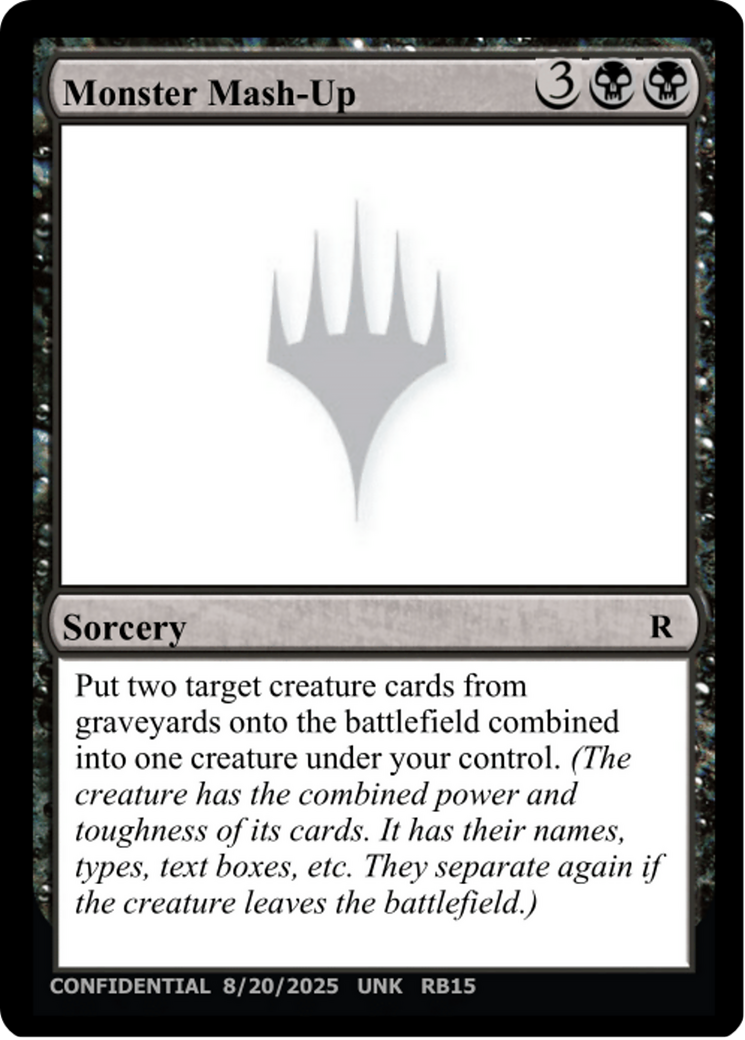 Put two target creatures from graveyards onto the battlefield combined into one creature under your control. (The creature has the combined power and toughness of its cards. It has their names, types, text boxes, etc. They separate again if the creature leaves the battlefield.)