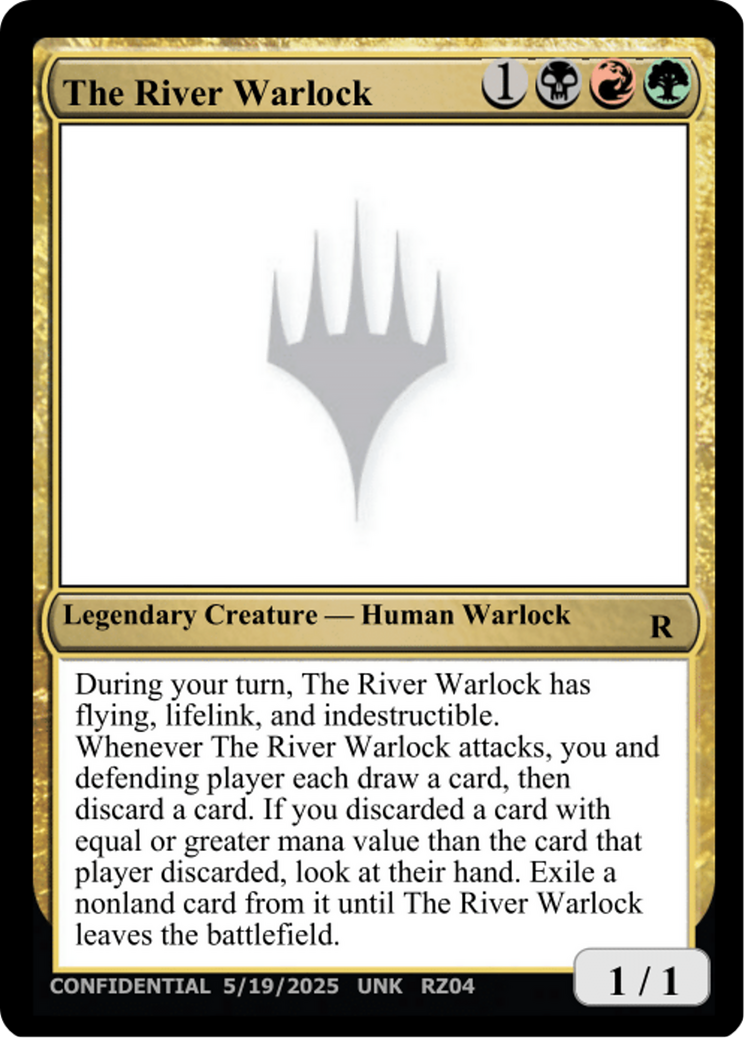 Whenever The River Warlock attacks, you and defending player each draw a card, then discard a card. If you discarded a card with equal or greater mana value than the card that player discarded, look at their hand. Exile a nonland card from it until The River Warlock leaves the battlefield.