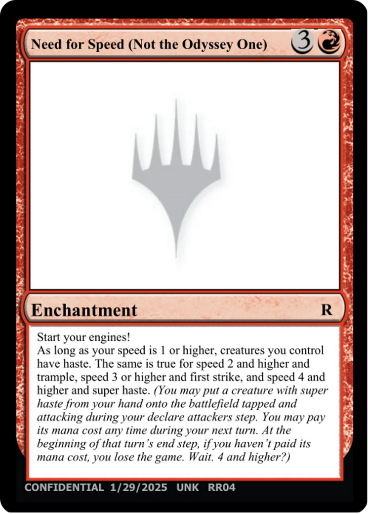 As long as your speed is 1 or higher, creatures you control have haste. The same is true for speed 2 and higher and trample, speed 3 or higher and first strike, and speed 4 and higher and super haste. (You may put a creature with super haste from your hand onto the battlefield tapped and attacking during your declare attackers step. You may pay its mana cost any time during your next turn. At the beginning of that turn's end step, if you haven't paid its mana cost, you lose the game. Wait. 4 and higher?)