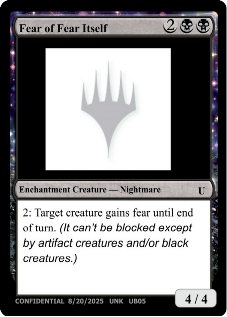 : Target creature gains fear until end of turn. (It can't be blocked except by artifact creatures and/or black creatures.)