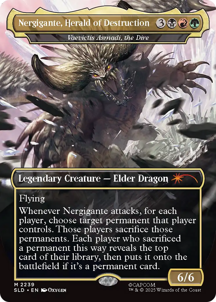 Whenever Vaevictis Asmadi attacks, for each player, choose target permanent that player controls. Those players sacrifice those permanents. Each player who sacrificed a permanent this way reveals the top card of their library, then puts it onto the battlefield if it's a permanent card.