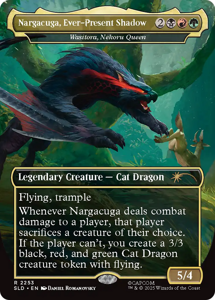 Whenever Wasitora deals combat damage to a player, that player sacrifices a creature of their choice. If the player can't, you create a 3/3 black, red, and green Cat Dragon creature token with flying.